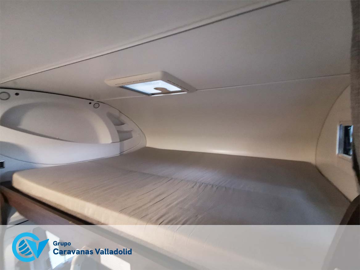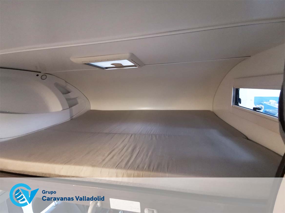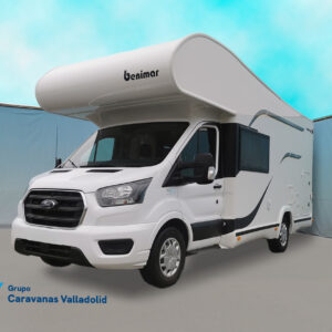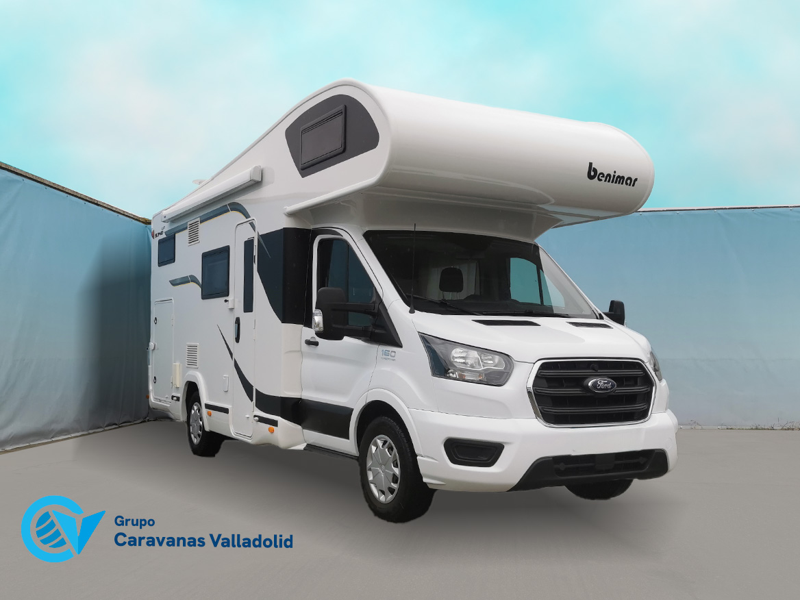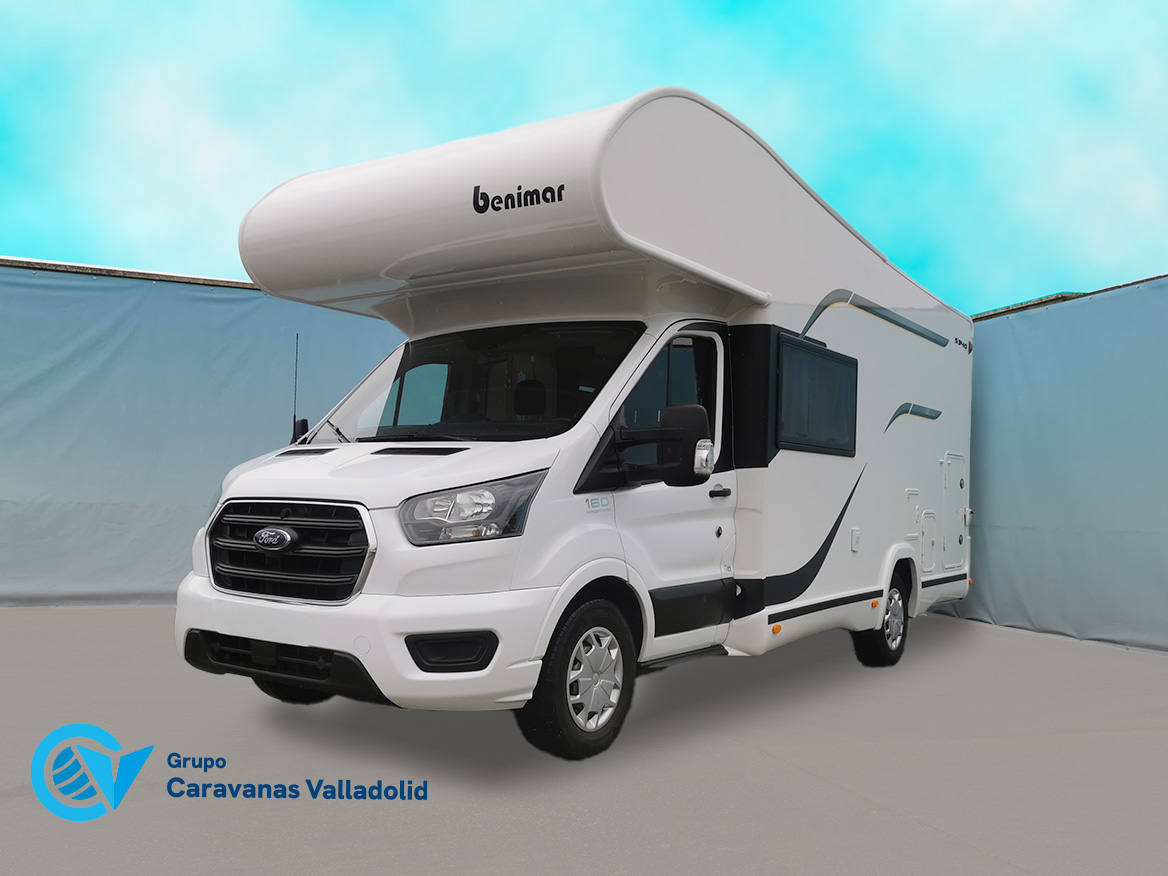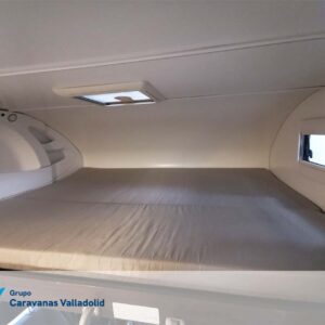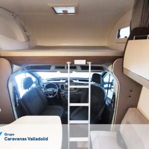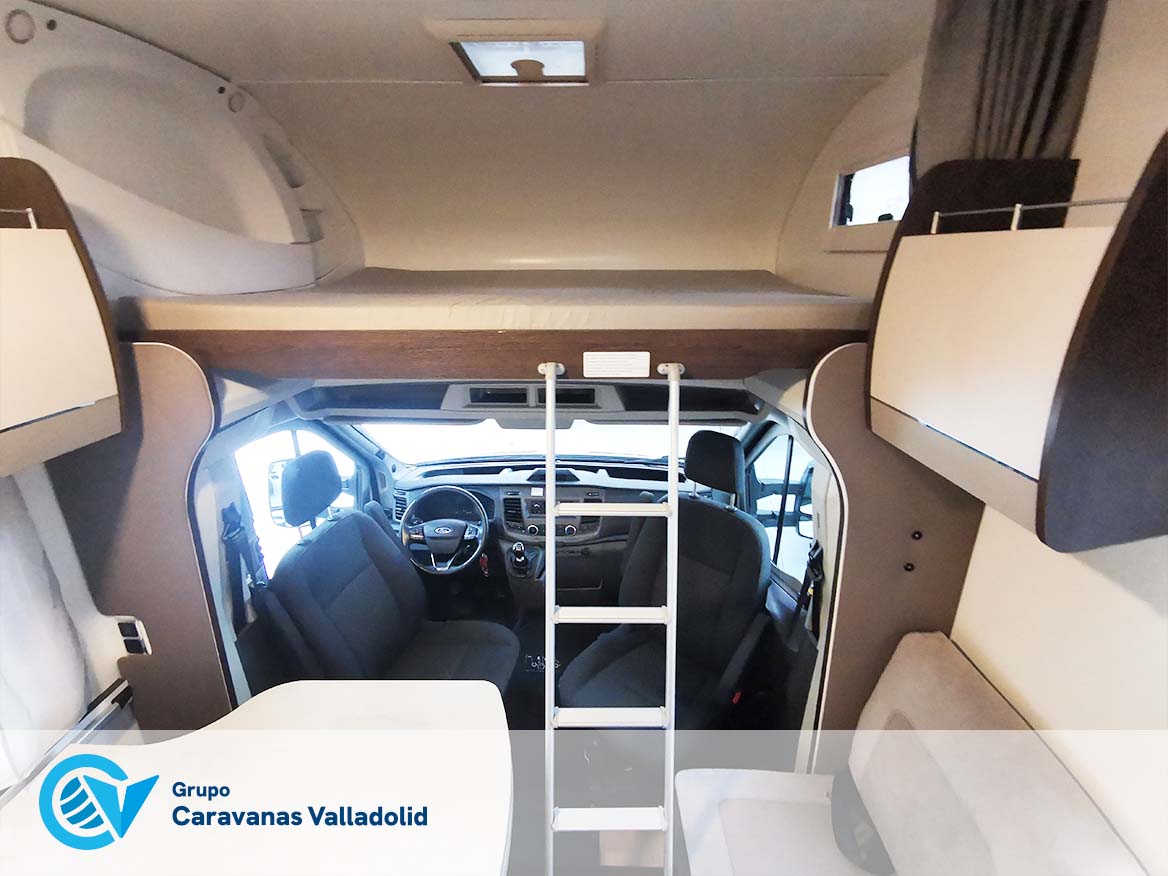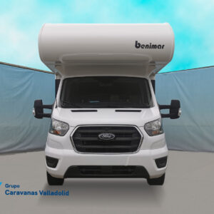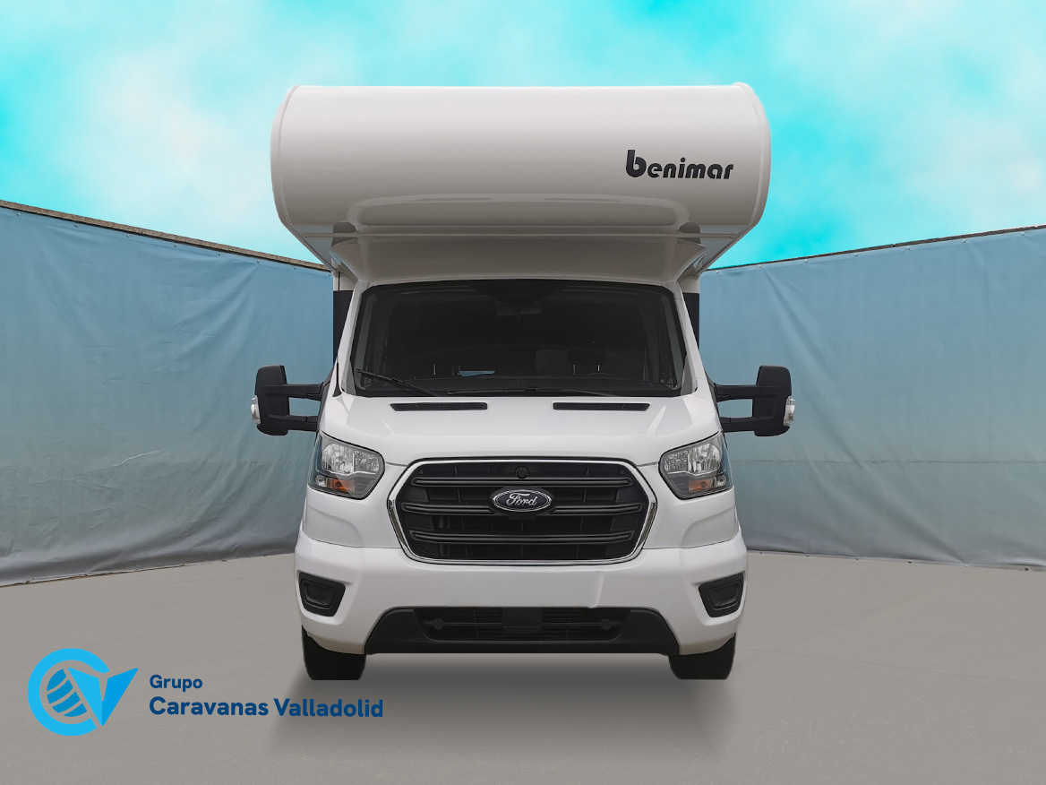 Autocaravana capuchina Benimar sport 340UP sobre chasis FORD de 160 CV, consta de cama transversal trasera y cama litera trasera, una encima de otra. Salón, Cama de matrimonio en capuchino, cocina y frigorífico independiente grande, armario empotrado y calefacción gasoil webasto y cierres fiamma.