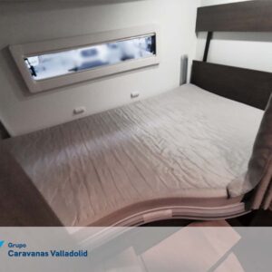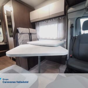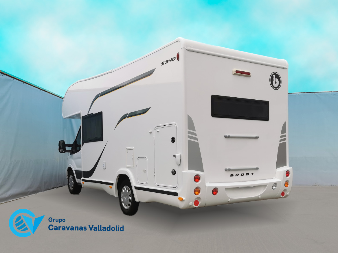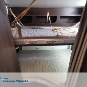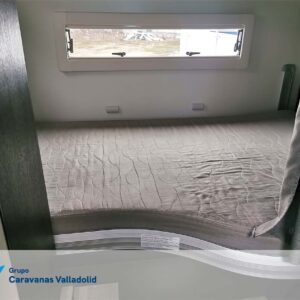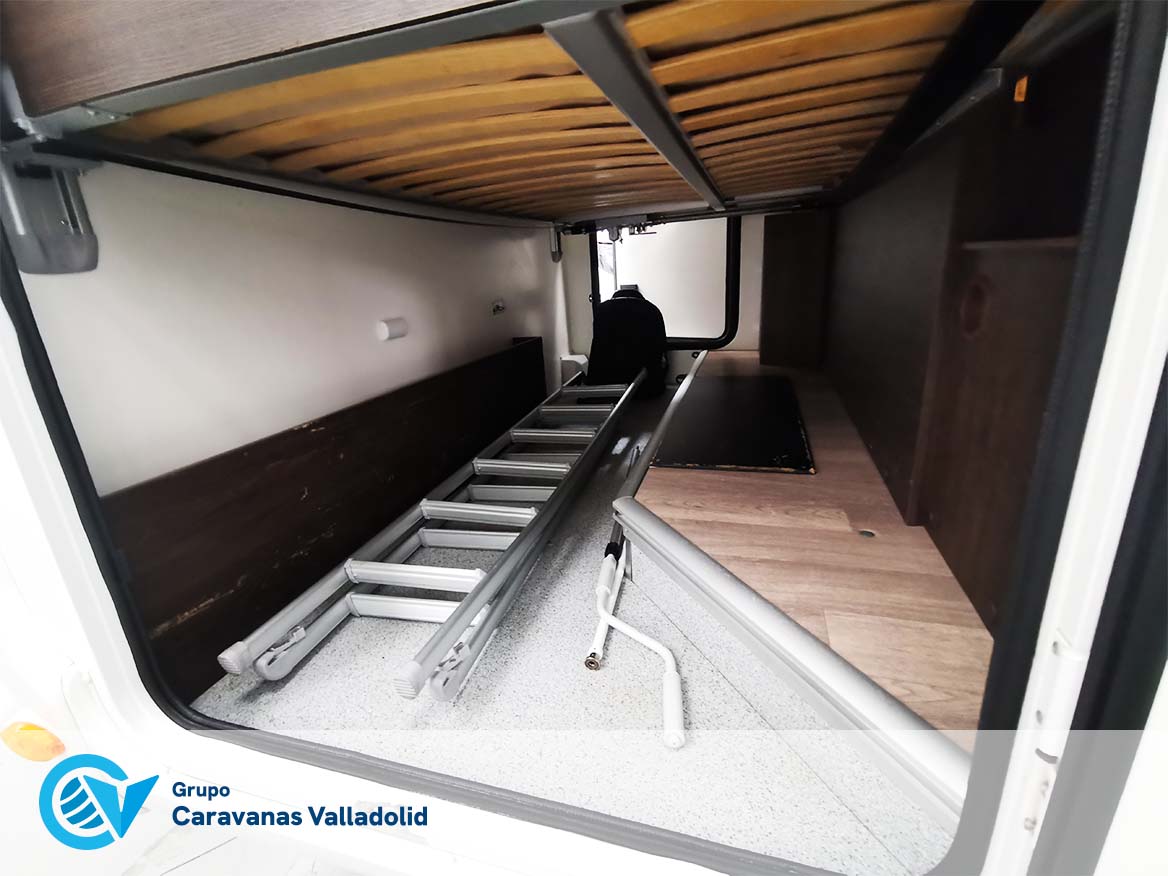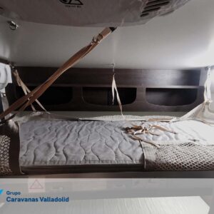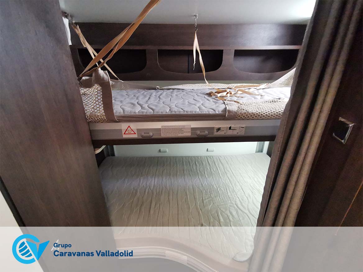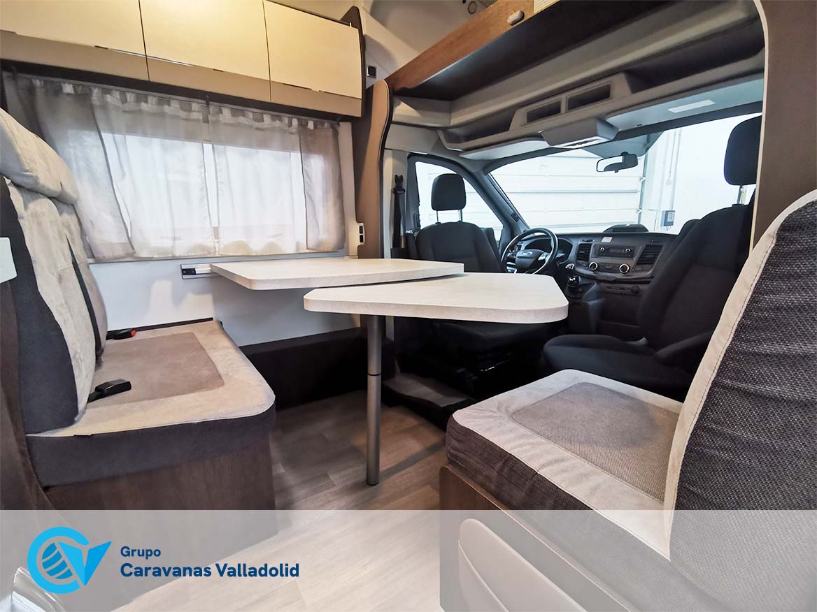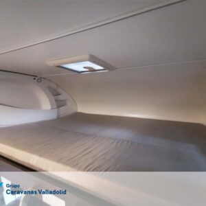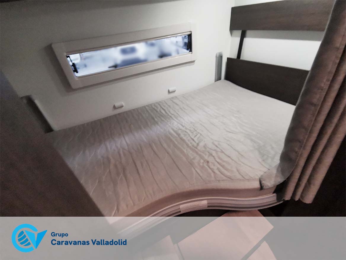 Autocaravana capuchina Benimar sport 340UP sobre chasis FORD de 160 CV, consta de cama transversal trasera y cama litera trasera, una encima de otra. Salón, Cama de matrimonio en capuchino, cocina y frigorífico independiente grande, armario empotrado y calefacción gasoil webasto y cierres fiamma.