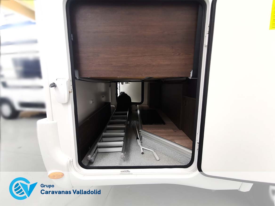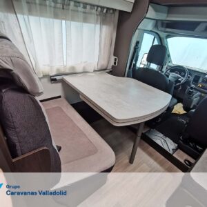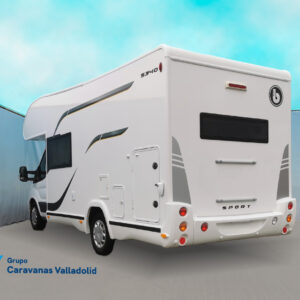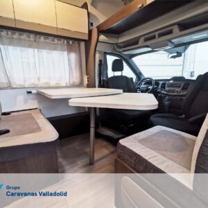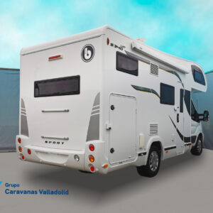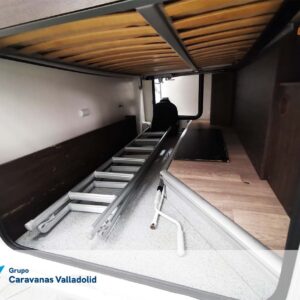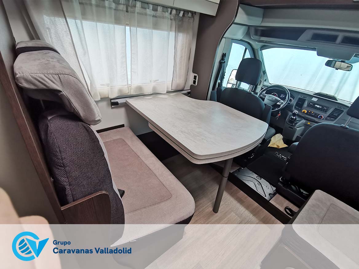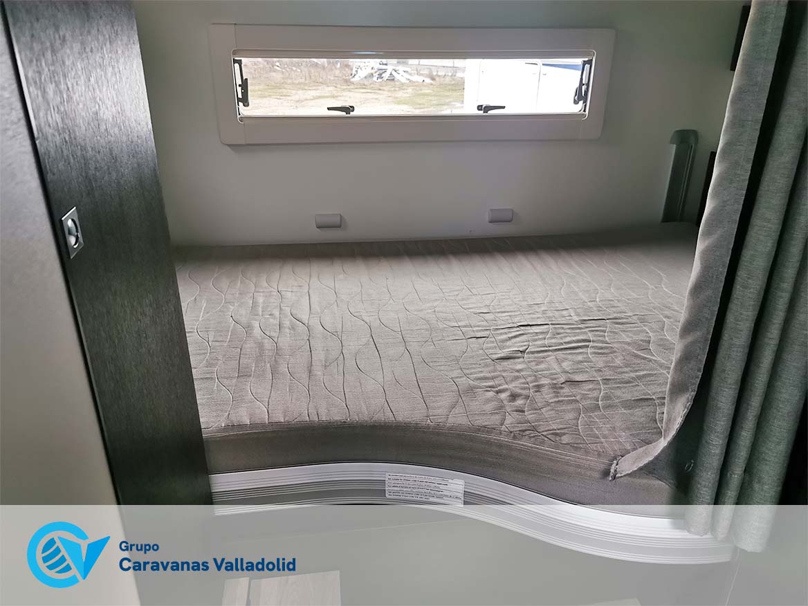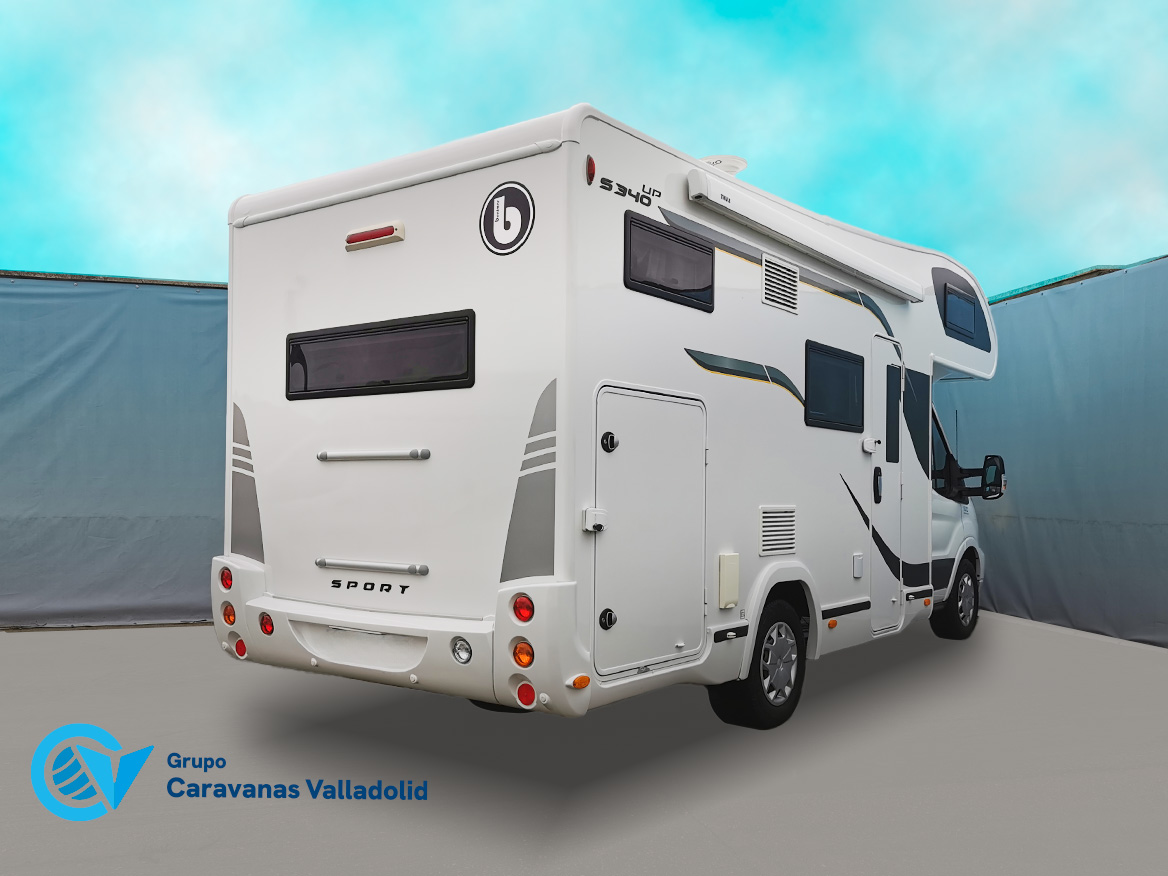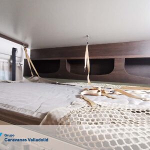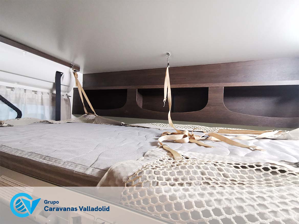Autocaravana capuchina Benimar sport 340UP sobre chasis FORD de 160 CV, consta de cama transversal trasera y cama litera trasera, una encima de otra. Salón, Cama de matrimonio en capuchino, cocina y frigorífico independiente grande, armario empotrado y calefacción gasoil webasto y cierres fiamma.