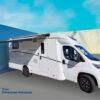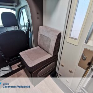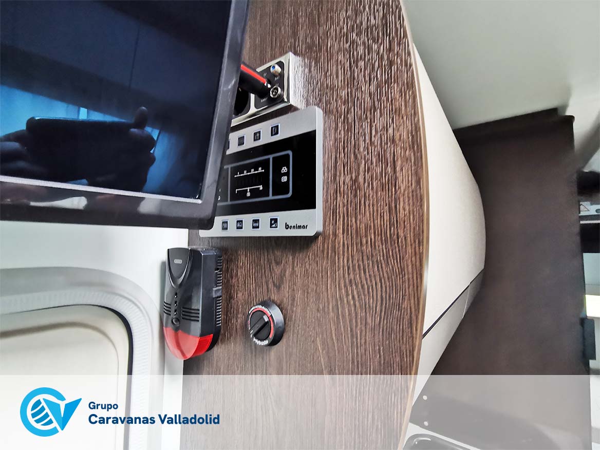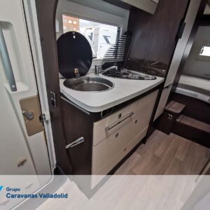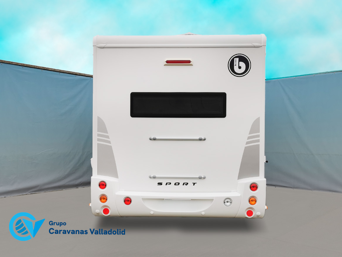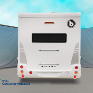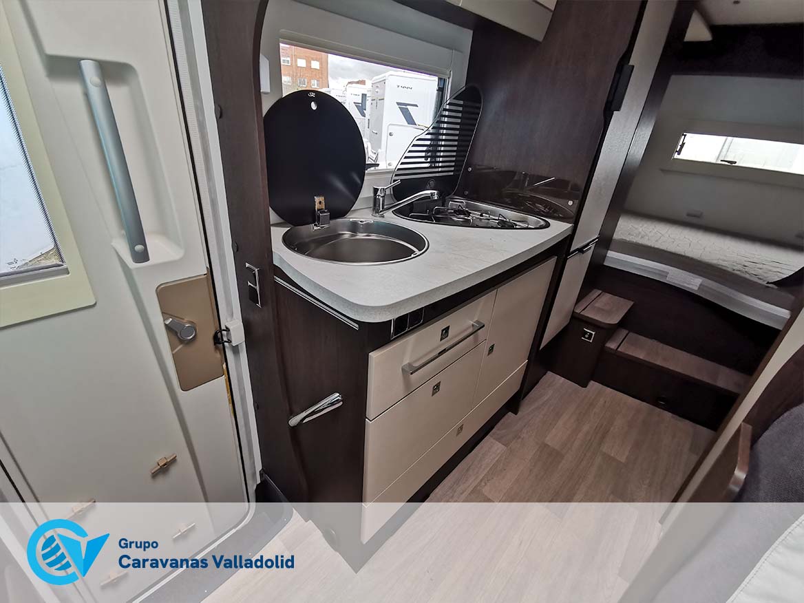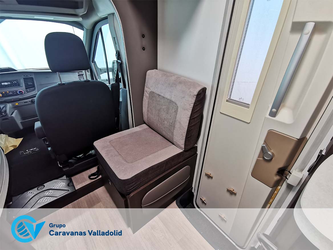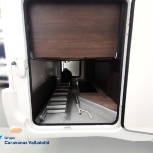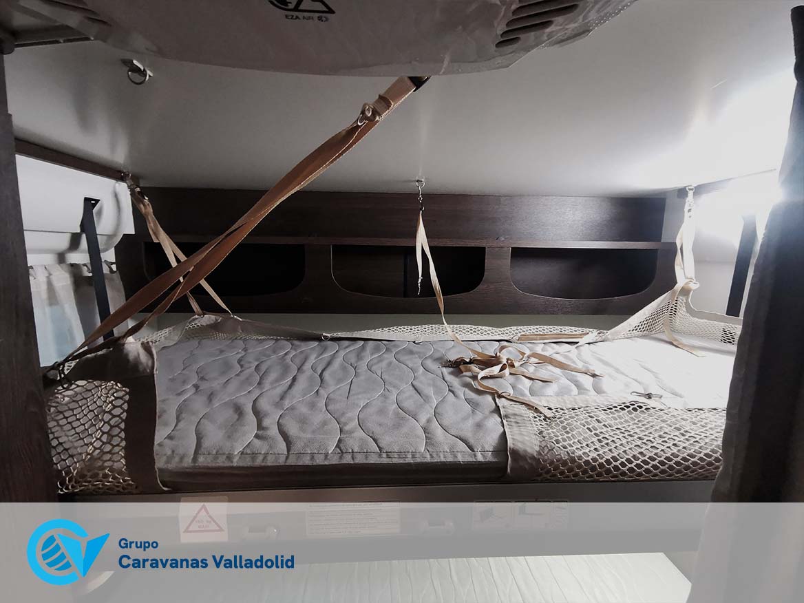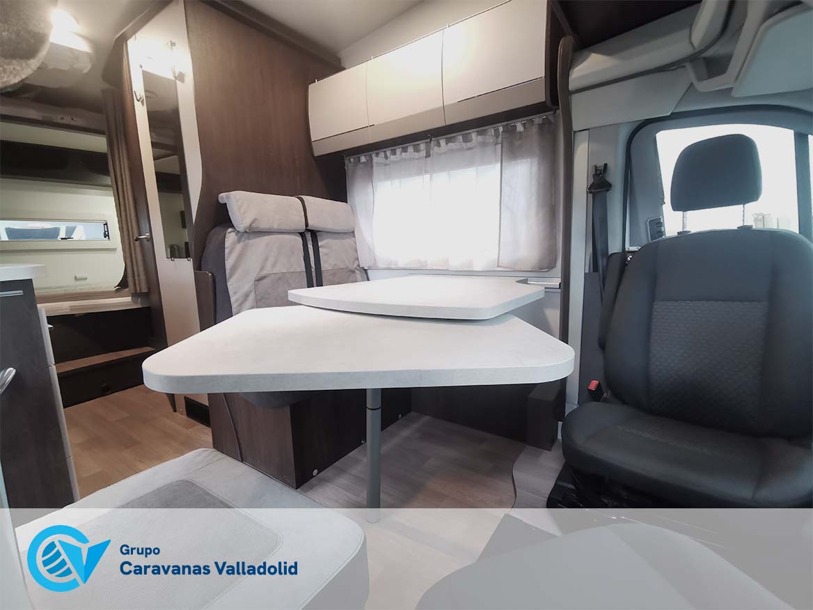 Autocaravana capuchina Benimar sport 340UP sobre chasis FORD de 160 CV, consta de cama transversal trasera y cama litera trasera, una encima de otra. Salón, Cama de matrimonio en capuchino, cocina y frigorífico independiente grande, armario empotrado y calefacción gasoil webasto y cierres fiamma.