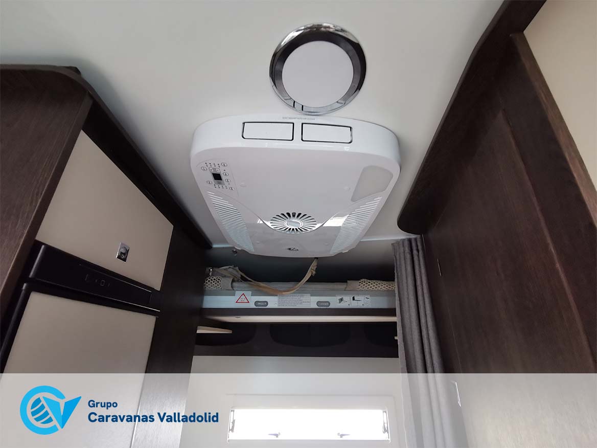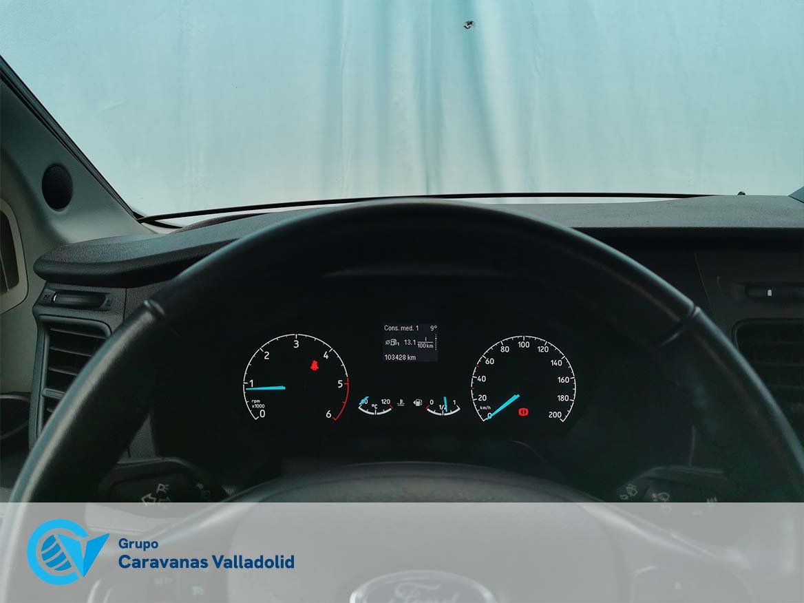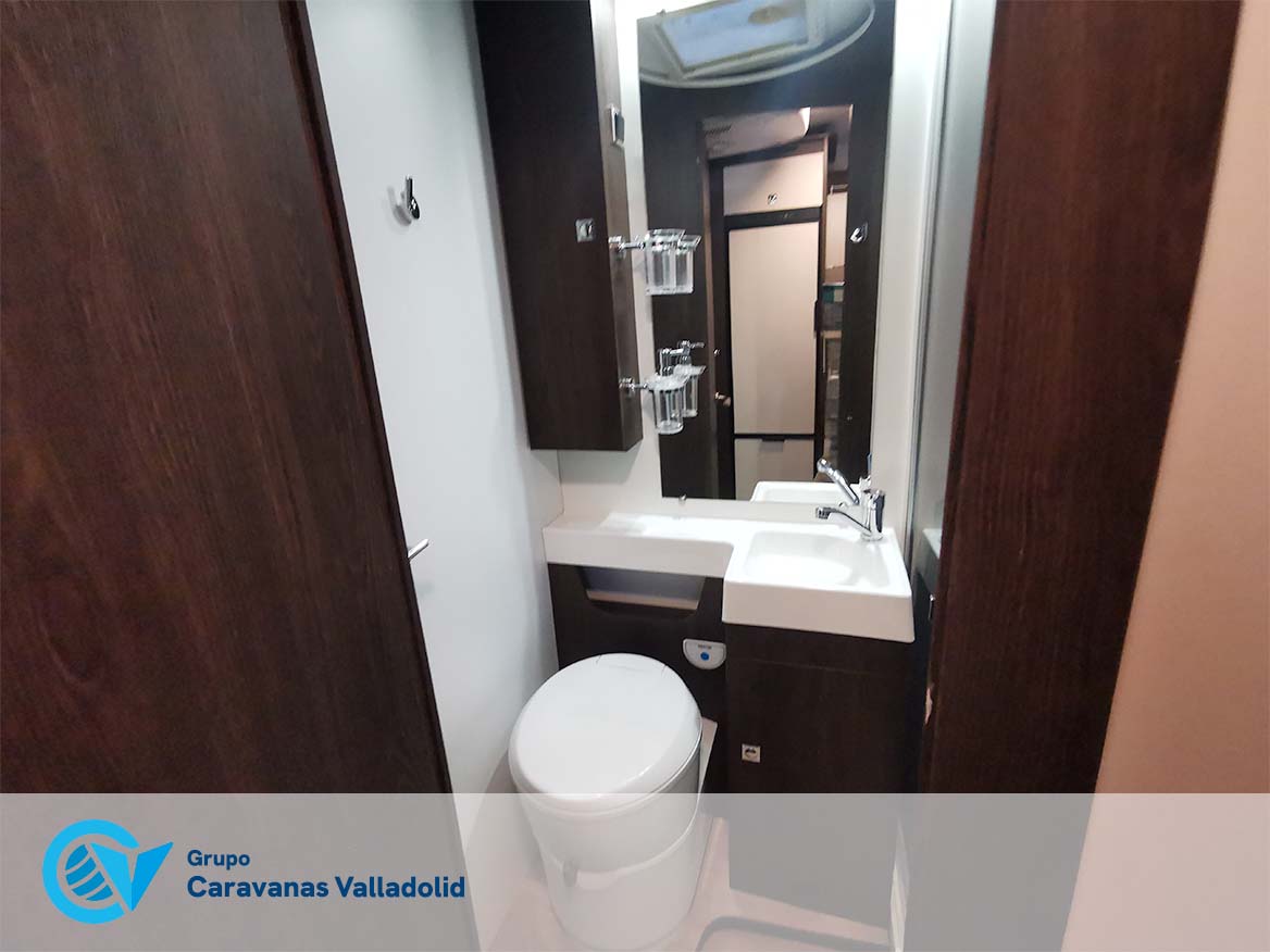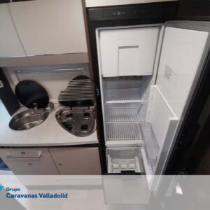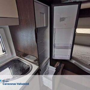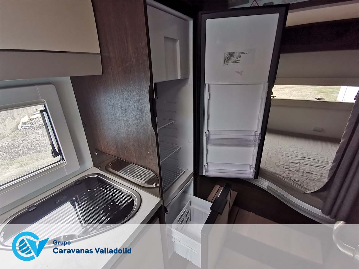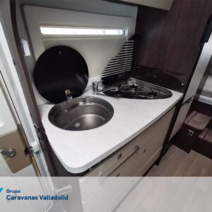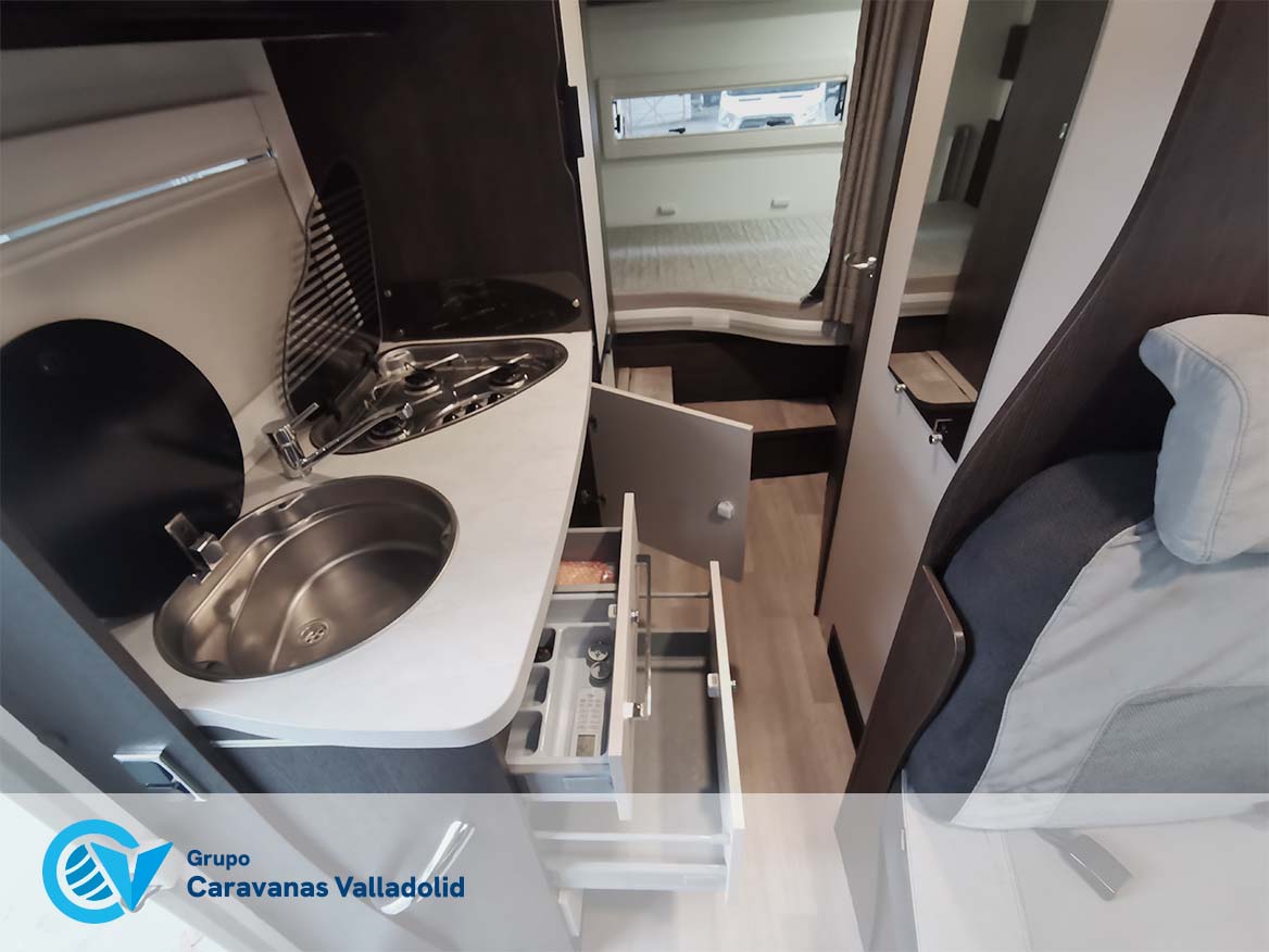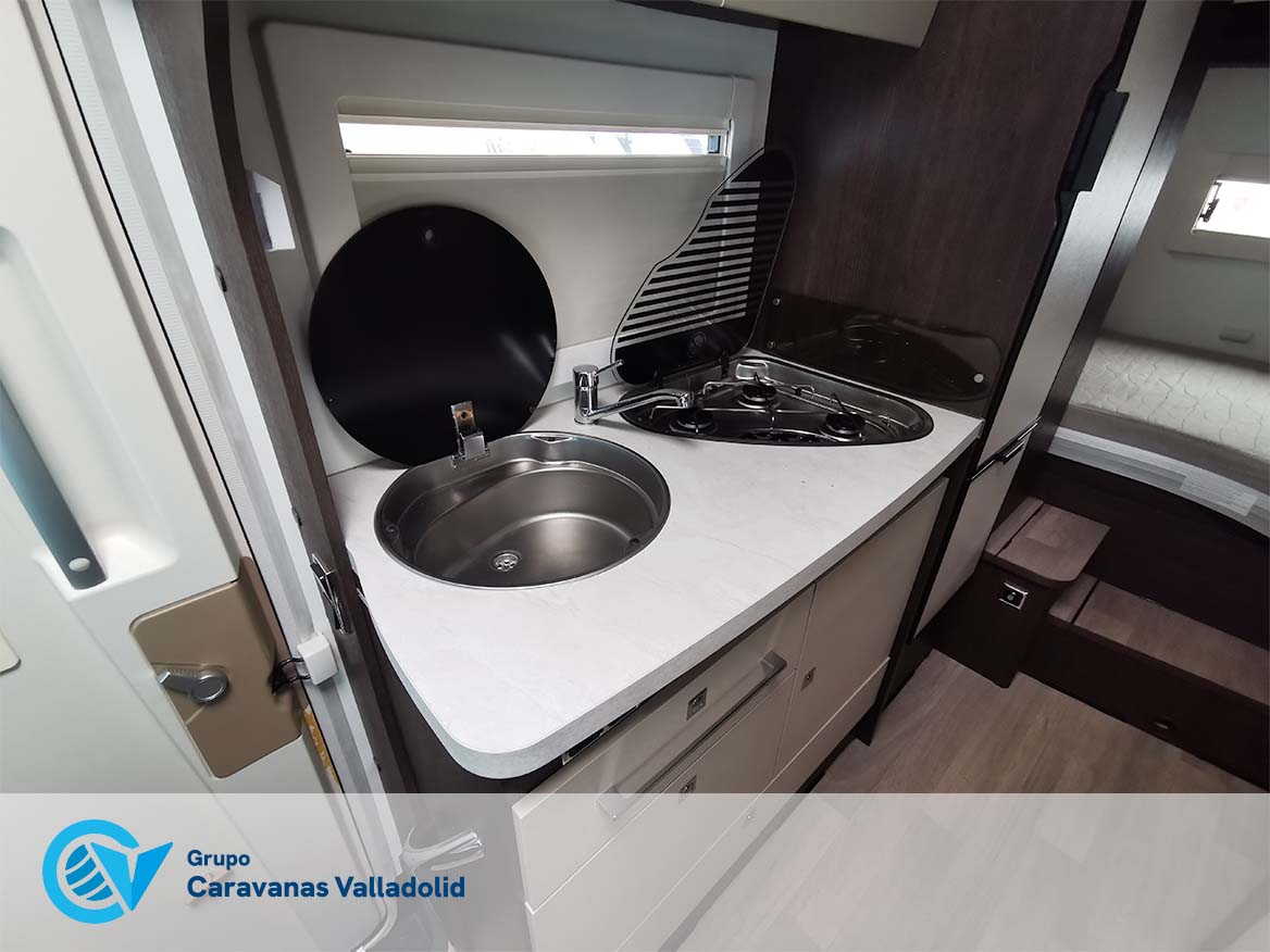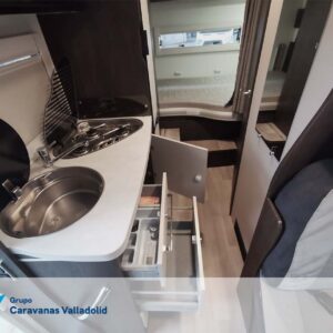 Autocaravana capuchina Benimar sport 340UP sobre chasis FORD de 160 CV, consta de cama transversal trasera y cama litera trasera, una encima de otra. Salón, Cama de matrimonio en capuchino, cocina y frigorífico independiente grande, armario empotrado y calefacción gasoil webasto y cierres fiamma.