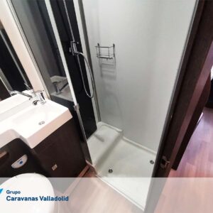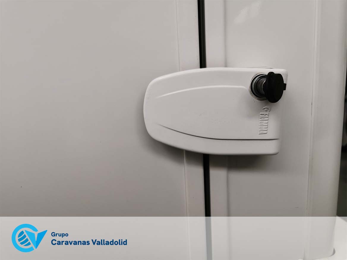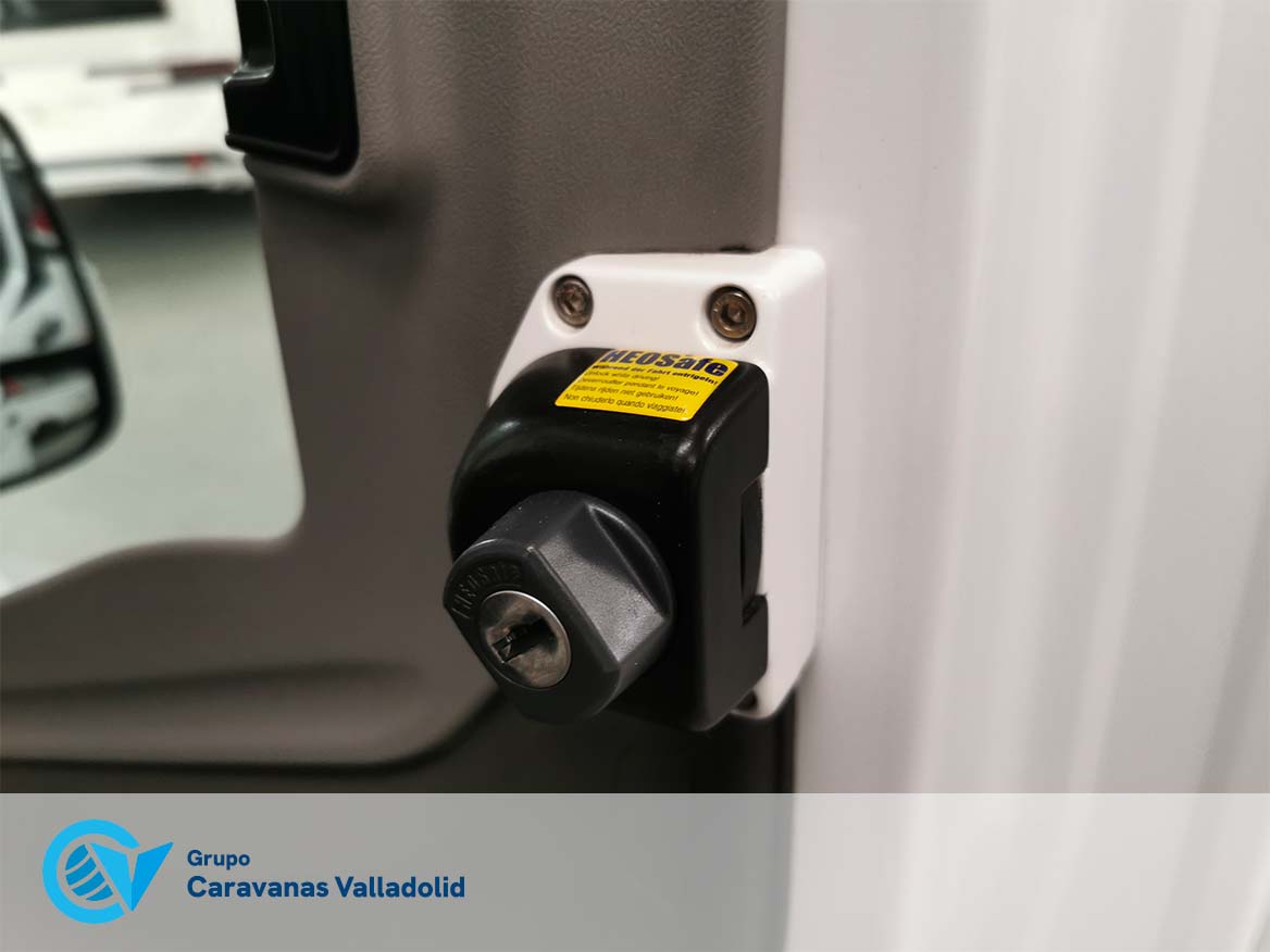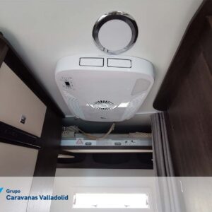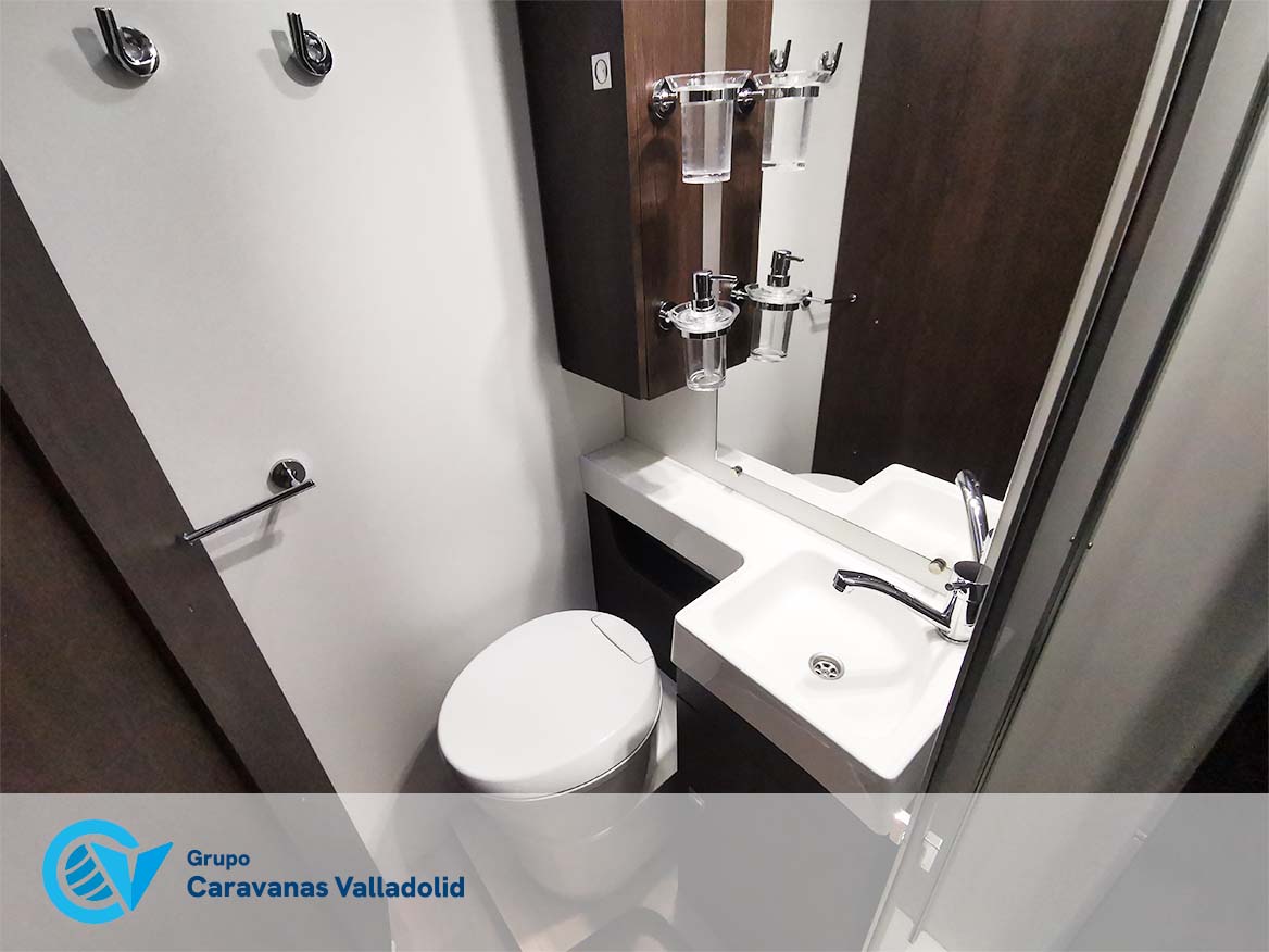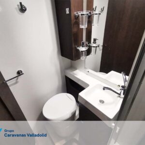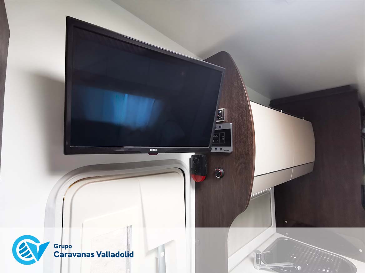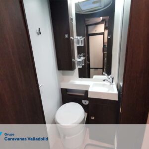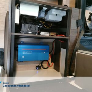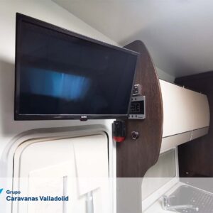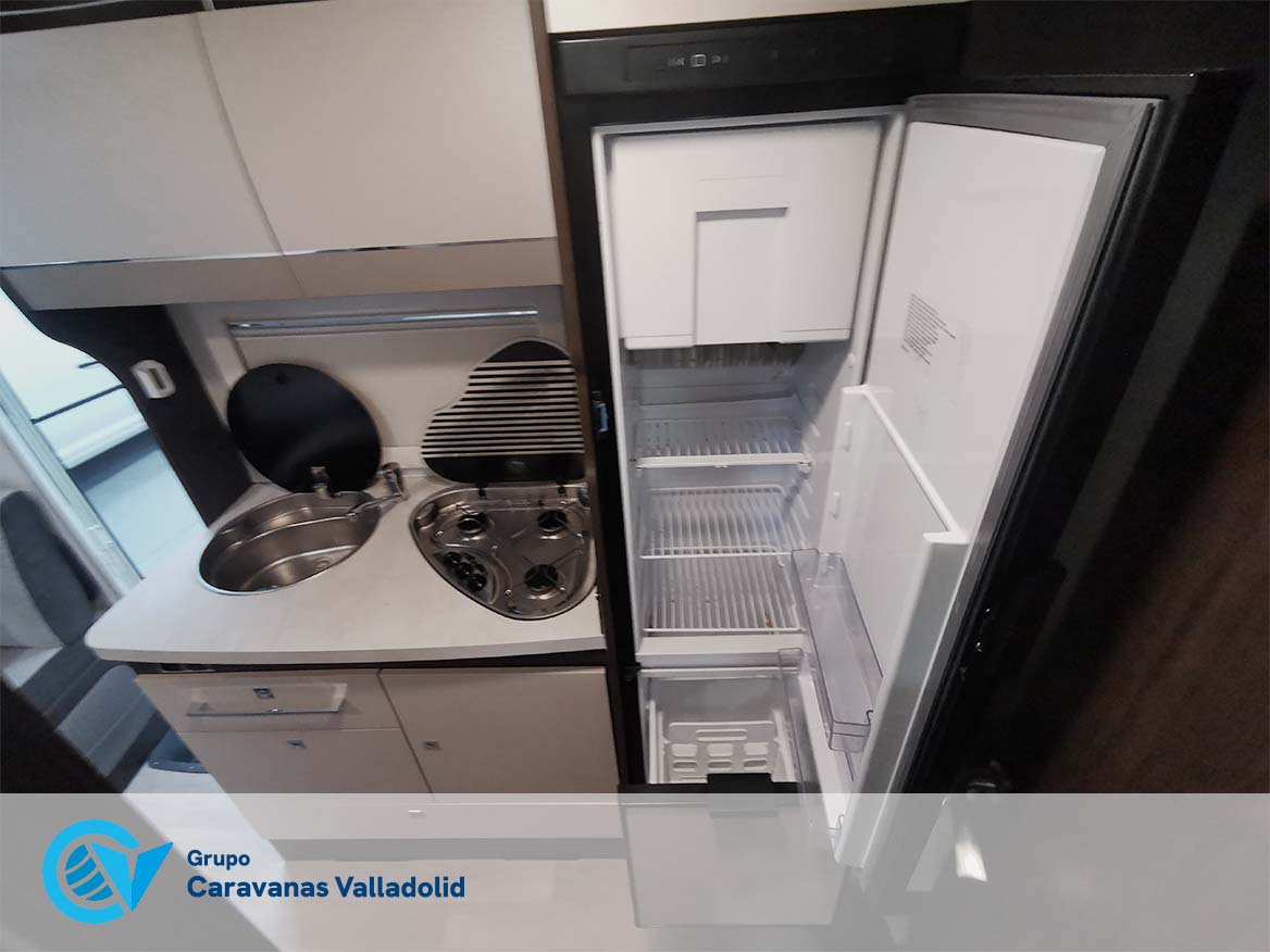 Autocaravana capuchina Benimar sport 340UP sobre chasis FORD de 160 CV, consta de cama transversal trasera y cama litera trasera, una encima de otra. Salón, Cama de matrimonio en capuchino, cocina y frigorífico independiente grande, armario empotrado y calefacción gasoil webasto y cierres fiamma.